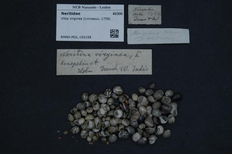 | Keywords: Naturalis Biodiversity Center - RMNH.MOL.150168 - Vitta virginea (Linnaeus, 1758) - Neritidae - Mollusc shell.jpeg artwork Dimensions artwork Document type Neritidae Vitta Individual count Infraspecific epithet Infraspecific rank Institution Naturalis Kind of unit artwork Kind of unit specimen shell Life stage Medium artwork Nomenclatural code Scale the width of the text on the species/QR-code label is 38 mm Occurrence ID page Other fields Other versions artwork Permission license Naturalis donation CC-0 Mollusca Publication location Scientific name Vitta virginea Linnaeus 1758 Scientific name authorship Linnaeus 1758 Source url http //bioportal naturalis nl Specific epithet virginea State or province Subject keywords artwork Subject keywords publication Title artwork Title publication Type status Uploaded with GWToolset Naturalis_Biodiversity_Center_-_RMNH MOL 150168_-_Vitta_virginea_ Linnaeus _1758 _-_Neritidae_-_Mollusc_shell http //medialib naturalis nl/file/id/RMNH MOL 150168/format/large Media donated by Naturalis Biodiversity Center Molluscs at Naturalis from the Rijksmuseum van Natuurlijke Historie Vitta virginea |