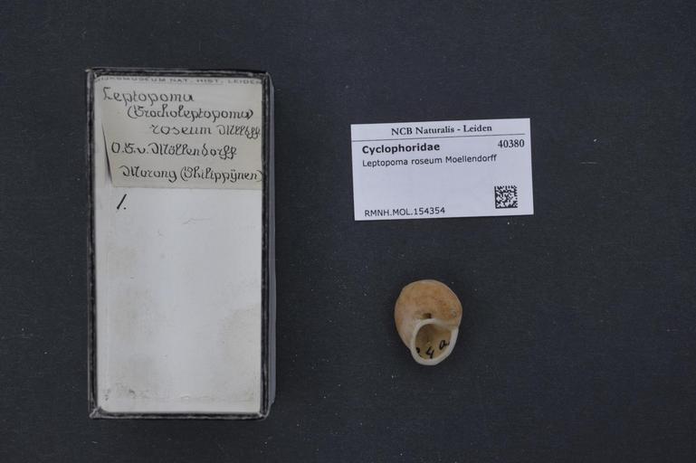 | Keywords: Naturalis Biodiversity Center - RMNH.MOL.154354 - Leptopoma roseum Von Moellendorff, 1888 - Cyclophoridae - Mollusc shell.jpeg artwork Dimensions artwork Document type Cyclophoridae subfamily Cyclophorinae Leptopoma Individual count Infraspecific epithet Infraspecific rank Institution Naturalis Kind of unit artwork Kind of unit specimen shell Life stage Philippines Medium artwork Nomenclatural code Scale the width of the text on the species/QR-code label is 38 mm Occurrence ID page Other fields Other versions artwork Permission license Naturalis donation CC-0 Mollusca Publication location Scientific name Leptopoma roseum Von Moellendorff 1888 Scientific name authorship Von Moellendorff 1888 Source url http //bioportal naturalis nl Specific epithet roseum State or province Subject keywords artwork Subject keywords publication Title artwork Title publication Type status possible syntype Uploaded with GWToolset Naturalis_Biodiversity_Center_-_RMNH MOL 154354_-_Leptopoma_roseum_Von_Moellendorff _1888_-_Cyclophoridae_-_Mollusc_shell http //medialib naturalis nl/file/id/RMNH MOL 154354/format/large Media donated by Naturalis Biodiversity Center Molluscs at Naturalis from the Rijksmuseum van Natuurlijke Historie Leptopoma roseum Leptopoma |