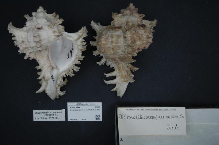 | Keywords: Naturalis Biodiversity Center - RMNH.MOL.129078 - Chicoreus ramosus (Linnaeus, 1758) - Muricidae - Mollusc shell.jpeg artwork Dimensions artwork Document type Muricidae subfamily Muricinae Chicoreus Individual count Infraspecific epithet Infraspecific rank Institution Naturalis Kind of unit artwork Kind of unit specimen shell Life stage Medium artwork Nomenclatural code Source institute Leiden Scale the width of the text on the species/QR-code label is 38 mm Occurrence ID page Neogastropoda Other fields Other versions artwork Permission license Naturalis donation CC-0 Mollusca Publication location Scientific name Chicoreus ramosus Linnaeus 1758 Scientific name authorship Linnaeus 1758 Source url http //bioportal naturalis nl Specific epithet ramosus State or province Subject keywords artwork Subject keywords publication Title artwork Title publication Type status Uploaded with GWToolset Naturalis_Biodiversity_Center_-_RMNH MOL 129078_-_Chicoreus_ramosus_ Linnaeus _1758 _-_Muricidae_-_Mollusc_shell http //medialib naturalis nl/file/id/RMNH MOL 129078/format/large Molluscs at Naturalis from the Rijksmuseum van Natuurlijke Historie Media donated by Naturalis Biodiversity Center Chicoreus ramosus |