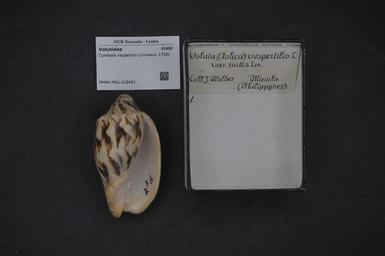 | Keywords: Naturalis Biodiversity Center - RMNH.MOL.210431 - Cymbiola vespertilio Linnaeus, 1758 - Volutidae - Mollusc shell.jpeg artwork Dimensions artwork Document type Volutidae Cymbiola Individual count Infraspecific epithet Infraspecific rank Institution Naturalis Kind of unit artwork Kind of unit specimen shell Life stage Medium artwork Nomenclatural code Source institute Rijksmuseum van Natuurlijke Historie Leiden Scale the width of the text on the species/QR-code label is 38 mm Occurrence ID page Neogastropoda Other fields Other versions artwork Permission license Naturalis donation CC-0 Mollusca Publication location Scientific name Cymbiola vespertilio Linnaeus 1758 Scientific name authorship Linnaeus 1758 Source url http //bioportal naturalis nl Specific epithet vespertilio State or province Subject keywords artwork Subject keywords publication Title artwork Title publication Type status Uploaded with GWToolset Naturalis_Biodiversity_Center_-_RMNH MOL 210431_-_Cymbiola_vespertilio_Linnaeus _1758_-_Volutidae_-_Mollusc_shell http //medialib naturalis nl/file/id/RMNH MOL 210431/format/large Media donated by Naturalis Biodiversity Center Molluscs at Naturalis from the Rijksmuseum van Natuurlijke Historie Cymbiola vespertilio Cymbiola |