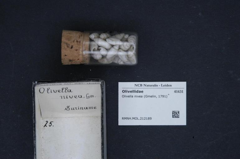 | Keywords: Naturalis Biodiversity Center - RMNH.MOL.212189 - Olivella nivea (Gmelin, 1791) - Olivellidae - Mollusc shell.jpeg artwork Dimensions artwork Document type Olivellidae Olivella Individual count Infraspecific epithet Infraspecific rank Institution Naturalis Kind of unit artwork Kind of unit specimen shell Life stage Medium artwork Nomenclatural code Source institute Rijksmuseum van Natuurlijke Historie Leiden Scale the width of the text on the species/QR-code label is 38 mm Occurrence ID page Other fields Other versions artwork Permission license Naturalis donation CC-0 Mollusca Publication location Scientific name Olivella nivea Gmelin 1791 Scientific name authorship Gmelin 1791 Source url http //bioportal naturalis nl Specific epithet nivea State or province Subject keywords artwork Subject keywords publication Title artwork Title publication Type status Uploaded with GWToolset Naturalis_Biodiversity_Center_-_RMNH MOL 212189_-_Olivella_nivea_ Gmelin _1791 _-_Olivellidae_-_Mollusc_shell http //medialib naturalis nl/file/id/RMNH MOL 212189/format/large Media donated by Naturalis Biodiversity Center Molluscs at Naturalis from the Rijksmuseum van Natuurlijke Historie Olivella nivea Olivella |
