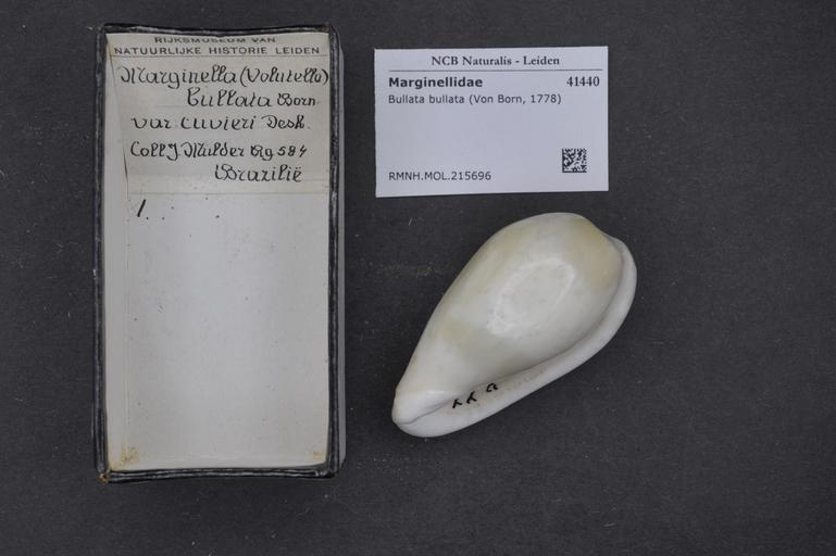 | Keywords: Naturalis Biodiversity Center - RMNH.MOL.215696 - Bullata bullata (Von Born, 1778) - Marginellidae - Mollusc shell.jpeg artwork Dimensions artwork Document type Marginellidae Bullata Individual count Infraspecific epithet Infraspecific rank Institution Naturalis Kind of unit artwork Kind of unit specimen shell Life stage Medium artwork Nomenclatural code Source institute Rijksmuseum van Natuurlijke Historie Leiden Scale the width of the text on the species/QR-code label is 38 mm Occurrence ID page Neogastropoda Other fields Other versions artwork Permission license Naturalis donation CC-0 Mollusca Publication location Scientific name Bullata bullata Von Born 1778 Scientific name authorship Von Born 1778 Source url http //bioportal naturalis nl Specific epithet bullata State or province Subject keywords artwork Subject keywords publication Title artwork Title publication Type status Uploaded with GWToolset Naturalis_Biodiversity_Center_-_RMNH MOL 215696_-_Bullata_bullata_ Von_Born _1778 _-_Marginellidae_-_Mollusc_shell http //medialib naturalis nl/file/id/RMNH MOL 215696/format/large Media donated by Naturalis Biodiversity Center Molluscs at Naturalis from the Rijksmuseum van Natuurlijke Historie Bullata bullata Bullata |