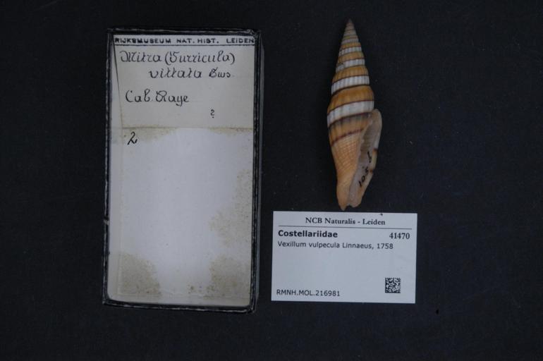 Keywords: Naturalis Biodiversity Center - RMNH.MOL.216981 - Vexillum vulpecula (Linnaeus, 1758) - Costellariidae - Mollusc shell.jpeg artwork Dimensions artwork Document type Costellariidae Vexillum Individual count Infraspecific epithet Infraspecific rank Institution Naturalis Kind of unit artwork Kind of unit specimen shell Life stage Medium artwork Nomenclatural code Source institute Rijksmuseum van Natuurlijke Historie Leiden Scale the width of the text on the species/QR-code label is 38 mm Occurrence ID page Neogastropoda Other fields Other versions artwork Permission license Naturalis donation CC-0 Mollusca Publication location Scientific name Vexillum vulpecula Linnaeus 1758 Scientific name authorship Linnaeus 1758 Source url http //bioportal naturalis nl Specific epithet vulpecula State or province Subject keywords artwork Subject keywords publication Title artwork Title publication Type status Uploaded with GWToolset Naturalis_Biodiversity_Center_-_RMNH MOL 216981_-_Vexillum_vulpecula_ Linnaeus _1758 _-_Costellariidae_-_Mollusc_shell http //medialib naturalis nl/file/id/RMNH MOL 216981/format/large Molluscs at Naturalis from the Rijksmuseum van Natuurlijke Historie Media donated by Naturalis Biodiversity Center Vexillum vulpecula Vexillum |