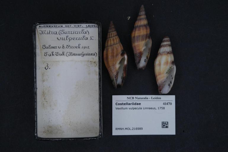Keywords: Naturalis Biodiversity Center - RMNH.MOL.216989 - Vexillum vulpecula (Linnaeus, 1758) - Costellariidae - Mollusc shell.jpeg artwork Dimensions artwork Document type Costellariidae Vexillum Individual count Infraspecific epithet Infraspecific rank Institution Naturalis Kind of unit artwork Kind of unit specimen shell Life stage Medium artwork Nomenclatural code Source institute Rijksmuseum van Natuurlijke Historie Leiden Scale the width of the text on the species/QR-code label is 38 mm Occurrence ID page Neogastropoda Other fields Other versions artwork Permission license Naturalis donation CC-0 Mollusca Publication location Scientific name Vexillum vulpecula Linnaeus 1758 Scientific name authorship Linnaeus 1758 Source url http //bioportal naturalis nl Specific epithet vulpecula State or province Subject keywords artwork Subject keywords publication Title artwork Title publication Type status Uploaded with GWToolset Naturalis_Biodiversity_Center_-_RMNH MOL 216989_-_Vexillum_vulpecula_ Linnaeus _1758 _-_Costellariidae_-_Mollusc_shell http //medialib naturalis nl/file/id/RMNH MOL 216989/format/large Molluscs at Naturalis from the Rijksmuseum van Natuurlijke Historie Media donated by Naturalis Biodiversity Center Vexillum vulpecula Vexillum