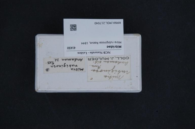 Keywords: Naturalis Biodiversity Center - RMNH.MOL.217040 1 - Mitra rubiginosa Reeve, 1844 - Mitridae - Mollusc shell.jpeg artwork Dimensions artwork Document type Mitridae subfamily Mitrinae Mitra Individual count Infraspecific epithet Infraspecific rank Institution Naturalis Kind of unit artwork Kind of unit specimen shell Life stage Medium artwork Nomenclatural code Source institute Rijksmuseum van Natuurlijke Historie Leiden Scale the width of the text on the species/QR-code label is 38 mm Occurrence ID page Neogastropoda Other fields Other versions artwork Permission license Naturalis donation CC-0 Mollusca Publication location Scientific name Mitra rubiginosa Reeve 1844 Scientific name authorship Reeve 1844 Source url http //bioportal naturalis nl Specific epithet rubiginosa State or province Subject keywords artwork Subject keywords publication Title artwork Title publication Type status Uploaded with GWToolset Naturalis_Biodiversity_Center_-_RMNH MOL 217040_1_-_Mitra_rubiginosa_Reeve _1844_-_Mitridae_-_Mollusc_shell http //medialib naturalis nl/file/id/RMNH MOL 217040_1/format/large Molluscs at Naturalis from the Rijksmuseum van Natuurlijke Historie Media donated by Naturalis Biodiversity Center Mitra rubiginosa Mitra