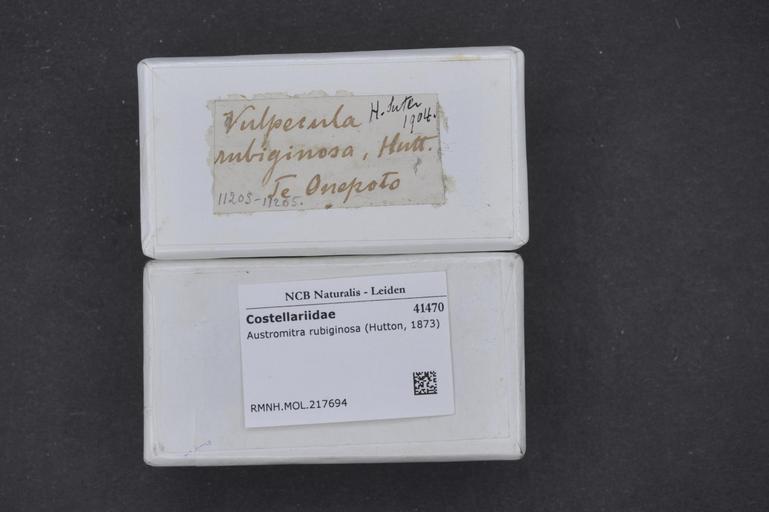 | Keywords: Naturalis Biodiversity Center - RMNH.MOL.217694 1 - Austromitra rubiginosa (Hutton, 1873) - Costellariidae - Mollusc shell.jpeg artwork Dimensions artwork Document type Costellariidae Austromitra Individual count Infraspecific epithet Infraspecific rank Institution Naturalis Kind of unit artwork Kind of unit specimen shell Life stage Medium artwork Nomenclatural code Source institute Rijksmuseum van Natuurlijke Historie Leiden Scale the width of the text on the species/QR-code label is 38 mm Occurrence ID page Neogastropoda Other fields Other versions artwork Permission license Naturalis donation CC-0 Mollusca Publication location Scientific name Austromitra rubiginosa Hutton 1873 Scientific name authorship Hutton 1873 Source url http //bioportal naturalis nl Specific epithet rubiginosa State or province Subject keywords artwork Subject keywords publication Title artwork Title publication Type status Uploaded with GWToolset Naturalis_Biodiversity_Center_-_RMNH MOL 217694_1_-_Austromitra_rubiginosa_ Hutton _1873 _-_Costellariidae_-_Mollusc_shell http //medialib naturalis nl/file/id/RMNH MOL 217694_1/format/large Molluscs at Naturalis from the Rijksmuseum van Natuurlijke Historie Media donated by Naturalis Biodiversity Center Austromitra rubiginosa Austromitra |