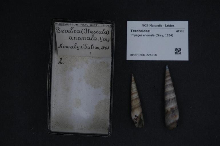 | Keywords: Naturalis Biodiversity Center - RMNH.MOL.226518 - Impages anomala (Gray, 1834) - Terebridae - Mollusc shell.jpeg artwork Dimensions artwork Document type Terebridae Impages Individual count Infraspecific epithet Infraspecific rank Institution Naturalis Kind of unit artwork Kind of unit specimen shell Life stage Medium artwork Nomenclatural code Source institute Rijksmuseum van Natuurlijke Historie Leiden Scale the width of the text on the species/QR-code label is 38 mm Occurrence ID page Other fields Other versions artwork Permission license Naturalis donation CC-0 Mollusca Publication location Scientific name Impages anomala Gray 1834 Scientific name authorship Gray 1834 Source url http //bioportal naturalis nl Specific epithet anomala State or province Subject keywords artwork Subject keywords publication Title artwork Title publication Type status Uploaded with GWToolset Naturalis_Biodiversity_Center_-_RMNH MOL 226518_-_Impages_anomala_ Gray _1834 _-_Terebridae_-_Mollusc_shell http //medialib naturalis nl/file/id/RMNH MOL 226518/format/large Molluscs at Naturalis from the Rijksmuseum van Natuurlijke Historie Media donated by Naturalis Biodiversity Center Impages anomala Impages |