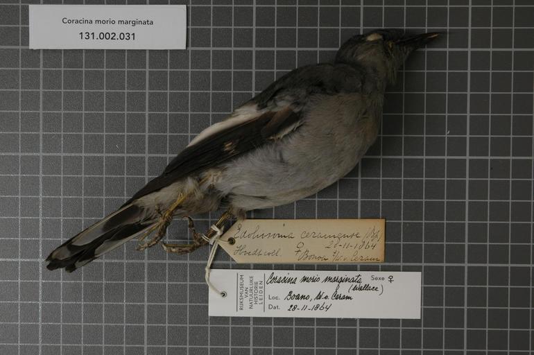 | Keywords: Naturalis Biodiversity Center - RMNH.AVES.123731 1 - Coracina morio marginata (Wallace, 1863) - Campephagidae - bird skin specimen.jpeg artwork Dimensions artwork Document type Campephagidae Coracina Individual count 1 Infraspecific epithet marginata Infraspecific rank Institution Naturalis Kind of unit artwork Kind of unit specimen skin Life stage Indonesia Boano W v Ceram Medium artwork Nomenclatural code Occurrence ID page Other fields Other versions artwork Permission license Naturalis donation CC-0 Publication location Scientific name Coracina morio marginata Wallace 1863 Scientific name authorship Wallace 1863 female Source url http //bioportal naturalis nl Specific epithet morio State or province Boano W v Ceram Subject keywords artwork Subject keywords publication Title artwork Title publication Type status Uploaded with GWToolset Naturalis_Biodiversity_Center_-_RMNH AVES 123731_1_-_Coracina_morio_marginata_ Wallace _1863 _-_Campephagidae_-_bird_skin_specimen http //medialib naturalis nl/file/id/RMNH AVES 123731_1/format/large Media donated by Naturalis Biodiversity Center Songbird specimens at Naturalis Biodiversity Center Coracina morio marginata |