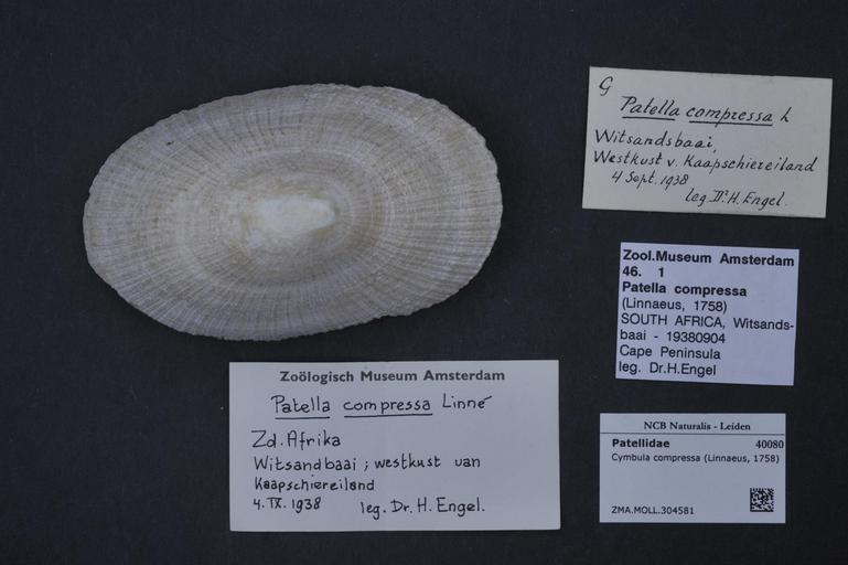Keywords: Naturalis Biodiversity Center - ZMA.MOLL.304581 - Cymbula compressa (Linnaeus, 1758) - H. Engel - Witsandbaai, South Africa - 1938.jpg Basis of record Preserved specimen Scientific name Cymbula compressa Linnaeus 1758 Catalog number ZMA MOLL 304581 Collection code Animalia Mollusca Gastropoda subclass Patellogastropoda Patellidae subfamily Patellinae Cymbula Specific epithet compressa Infraspecific rank Infraspecific epithet Scientific name authorship Linnaeus 1758 Nomenclatural code Kind of unit specimen Shell Air dried Type status None Life stage Individual count South Africa State or province Western Cape Witsandbaai Collection date September 4 1938 Legacy Dr H Engel Occurrence ID http //bioportal naturalis nl/ Bioportal Naturalis Biodiversity Center<br> page Institution Naturalis Source url http //medialib naturalis nl/file/id/ZMA MOLL 304581/format/large Medialib naturalis nl Permission license Naturalis donation CC-0 Uploaded with UploadWizard Media donated by Naturalis Biodiversity Center Cymbula compressa Western Cape Molluscs at Naturalis from the Zoölogisch Museum Amsterdam |