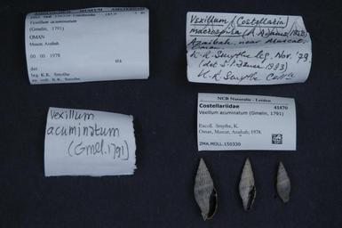 Keywords: Naturalis Biodiversity Center - ZMA.MOLL.150330 - Vexillum acuminatum (Gmelin, 1791) - Costellariidae - Mollusc shell.jpeg artwork Dimensions artwork Document type Costellariidae Vexillum Individual count Infraspecific epithet Infraspecific rank Institution Naturalis Kind of unit artwork Kind of unit specimen shell Life stage Oman Muscat Azaibah; 1978 Medium artwork Nomenclatural code Collection remarks Moll Scale the width of the text on the species/QR-code label is 38 mm Occurrence ID page Neogastropoda Other fields Other versions artwork Permission license Naturalis donation CC-0 Mollusca Publication location Scientific name Vexillum acuminatum Gmelin 1791 Scientific name authorship Gmelin 1791 Source url http //bioportal naturalis nl Specific epithet acuminatum State or province Subject keywords artwork Subject keywords publication Title artwork Title publication Type status Uploaded with GWToolset Naturalis_Biodiversity_Center_-_ZMA MOLL 150330_-_Vexillum_acuminatum_ Gmelin _1791 _-_Costellariidae_-_Mollusc_shell http //medialib naturalis nl/file/id/ZMA MOLL 150330/format/large Media donated by Naturalis Biodiversity Center Molluscs at Naturalis from the Zoölogisch Museum Amsterdam Vexillum acuminatum Vexillum