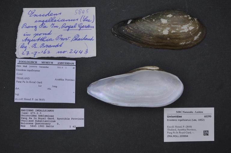 | Keywords: Naturalis Biodiversity Center - ZMA.MOLL.209994 - Ensidens ingallsianus (Lea, 1852) - Unionidae - Mollusc shell.jpeg artwork Dimensions artwork Document type Unionidae subfamily Ambleminae Ensidens Individual count Infraspecific epithet Infraspecific rank Institution Naturalis Kind of unit artwork Kind of unit specimen shell Life stage Thailand Ayutthia Province Pang Pa In Royal Gard Medium artwork Nomenclatural code Scale the width of the text on the species/QR-code label is 38 mm Occurrence ID page Other fields Other versions artwork Permission license Naturalis donation CC-0 Mollusca Publication location Scientific name Ensidens ingallsianus Lea 1852 Scientific name authorship Lea 1852 Source url http //bioportal naturalis nl Specific epithet ingallsianus State or province Ayutthia Province Subject keywords artwork Subject keywords publication Title artwork Title publication Type status Uploaded with GWToolset Naturalis_Biodiversity_Center_-_ZMA MOLL 209994_-_Ensidens_ingallsianus_ Lea _1852 _-_Unionidae_-_Mollusc_shell http //medialib naturalis nl/file/id/ZMA MOLL 209994/format/large Media donated by Naturalis Biodiversity Center Molluscs at Naturalis from the Zoölogisch Museum Amsterdam Ensidens ingallsianus Ensidens |