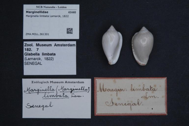 | Keywords: Naturalis Biodiversity Center - ZMA.MOLL.361301 - Marginella limbata Lamarck, 1822 - Marginellidae - Mollusc shell.jpeg artwork Dimensions artwork Document type Marginellidae Marginella Individual count Infraspecific epithet Infraspecific rank Institution Naturalis Kind of unit artwork Kind of unit specimen shell Life stage Medium artwork Nomenclatural code Source institute Zoölogisch Museum Amsterdam Scale the width of the text on the species/QR-code label is 38 mm Occurrence ID page Neogastropoda Other fields Other versions artwork Permission license Naturalis donation CC-0 Mollusca Publication location Scientific name Marginella limbata Lamarck 1822 Scientific name authorship Lamarck 1822 Source url http //bioportal naturalis nl Specific epithet limbata State or province Subject keywords artwork Subject keywords publication Title artwork Title publication Type status Uploaded with GWToolset Naturalis_Biodiversity_Center_-_ZMA MOLL 361301_-_Marginella_limbata_Lamarck _1822_-_Marginellidae_-_Mollusc_shell http //medialib naturalis nl/file/id/ZMA MOLL 361301/format/large Media donated by Naturalis Biodiversity Center Molluscs at Naturalis from the Zoölogisch Museum Amsterdam Marginella limbata Marginella |