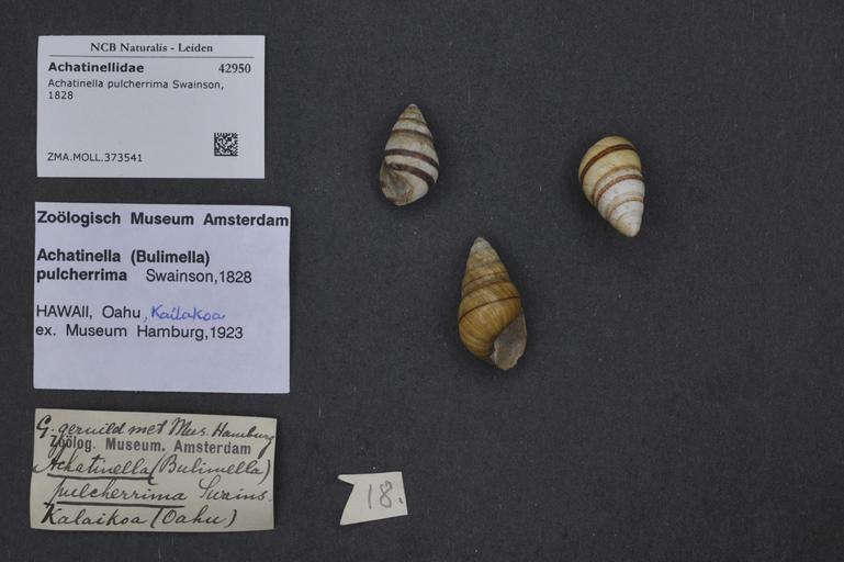 | Keywords: Naturalis Biodiversity Center - ZMA.MOLL.373541 - Achatinella pulcherrima Swainson, 1828 - Achatinellidae - Mollusc shell.jpeg artwork Dimensions artwork Document type Achatinellidae subfamily Achatinellinae Achatinella Individual count Infraspecific epithet Infraspecific rank Institution Naturalis Kind of unit artwork Kind of unit specimen shell Life stage Medium artwork Nomenclatural code Source institute Rijksmuseum van Natuurlijke Historie Leiden Scale the width of the text on the species/QR-code label is 38 mm Occurrence ID page Other fields Other versions artwork Permission license Naturalis donation CC-0 Mollusca Publication location Scientific name Achatinella pulcherrima Swainson 1828 Scientific name authorship Swainson 1831 Source url http //bioportal naturalis nl Specific epithet pulcherrima State or province Subject keywords artwork Subject keywords publication Title artwork Title publication Type status Uploaded with GWToolset Naturalis_Biodiversity_Center_-_ZMA MOLL 373541_-_Achatinella_pulcherrima_Swainson _1828_-_Achatinellidae_-_Mollusc_shell http //medialib naturalis nl/file/id/ZMA MOLL 373541/format/large Molluscs at Naturalis from the Zoölogisch Museum Amsterdam Media donated by Naturalis Biodiversity Center Achatinella pulcherrima Achatinella |