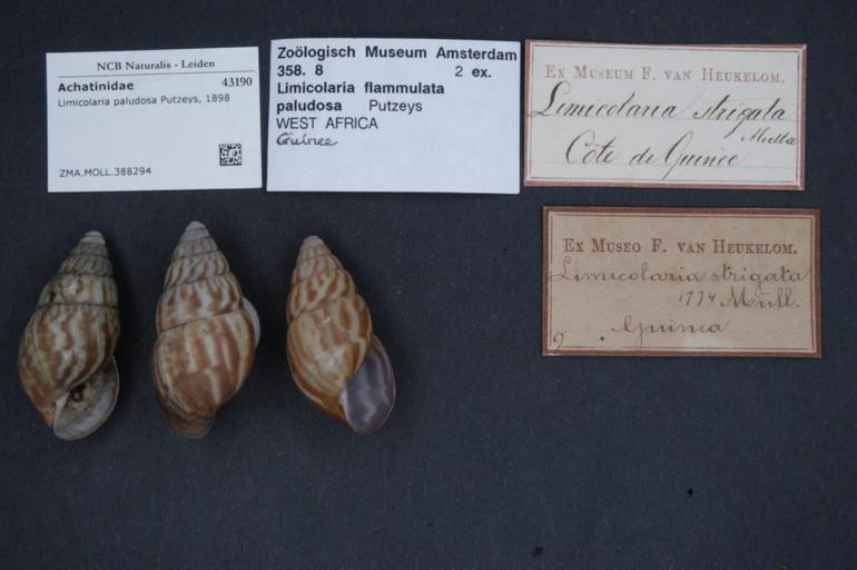 | Keywords: Naturalis Biodiversity Center - ZMA.MOLL.388294 - Limicolaria paludosa Putzeys, 1898 - Achatinidae - Mollusc shell.jpeg artwork Dimensions artwork Document type Achatinidae Limicolaria Individual count Infraspecific epithet Infraspecific rank Institution Naturalis Kind of unit artwork Kind of unit specimen shell Life stage Medium artwork Nomenclatural code Source institute Rijksmuseum van Natuurlijke Historie Leiden Scale the width of the text on the species/QR-code label is 38 mm Occurrence ID page Other fields Other versions artwork Permission license Naturalis donation CC-0 Mollusca Publication location Scientific name Limicolaria paludosa Putzeys 1898 Scientific name authorship Putzeys 1898 Source url http //bioportal naturalis nl Specific epithet paludosa State or province Subject keywords artwork Subject keywords publication Title artwork Title publication Type status Uploaded with GWToolset Naturalis_Biodiversity_Center_-_ZMA MOLL 388294_-_Limicolaria_paludosa_Putzeys _1898_-_Achatinidae_-_Mollusc_shell http //medialib naturalis nl/file/id/ZMA MOLL 388294/format/large Molluscs at Naturalis from the Zoölogisch Museum Amsterdam Media donated by Naturalis Biodiversity Center Limicolaria paludosa Limicolaria |
