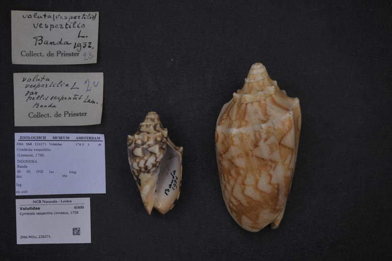 | Keywords: Naturalis Biodiversity Center - ZMA.MOLL.226271 - Cymbiola vespertilio Linnaeus, 1758 - Volutidae - Mollusc shell.jpeg artwork Dimensions artwork Document type Volutidae Cymbiola Individual count Infraspecific epithet Infraspecific rank Institution Naturalis Kind of unit artwork Kind of unit specimen shell Life stage Medium artwork Nomenclatural code Scale the width of the text on the species/QR-code label is 38 mm Occurrence ID page Neogastropoda Other fields Other versions artwork Permission license Naturalis donation CC-0 Mollusca Publication location Scientific name Cymbiola vespertilio Linnaeus 1758 Scientific name authorship Linnaeus 1758 Source url http //bioportal naturalis nl Specific epithet vespertilio State or province Subject keywords artwork Subject keywords publication Title artwork Title publication Type status Uploaded with GWToolset Naturalis_Biodiversity_Center_-_ZMA MOLL 226271_-_Cymbiola_vespertilio_Linnaeus _1758_-_Volutidae_-_Mollusc_shell http //medialib naturalis nl/file/id/ZMA MOLL 226271/format/large Media donated by Naturalis Biodiversity Center Molluscs at Naturalis from the Zoölogisch Museum Amsterdam Cymbiola vespertilio Cymbiola |