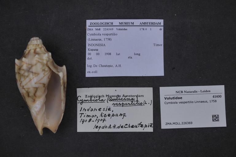 | Keywords: Naturalis Biodiversity Center - ZMA.MOLL.226369 - Cymbiola vespertilio Linnaeus, 1758 - Volutidae - Mollusc shell.jpeg artwork Dimensions artwork Document type Volutidae Cymbiola Individual count Infraspecific epithet Infraspecific rank Institution Naturalis Kind of unit artwork Kind of unit specimen shell Life stage Medium artwork Nomenclatural code Scale the width of the text on the species/QR-code label is 38 mm Occurrence ID page Neogastropoda Other fields Other versions artwork Permission license Naturalis donation CC-0 Mollusca Publication location Scientific name Cymbiola vespertilio Linnaeus 1758 Scientific name authorship Linnaeus 1758 Source url http //bioportal naturalis nl Specific epithet vespertilio State or province Subject keywords artwork Subject keywords publication Title artwork Title publication Type status Uploaded with GWToolset Naturalis_Biodiversity_Center_-_ZMA MOLL 226369_-_Cymbiola_vespertilio_Linnaeus _1758_-_Volutidae_-_Mollusc_shell http //medialib naturalis nl/file/id/ZMA MOLL 226369/format/large Media donated by Naturalis Biodiversity Center Molluscs at Naturalis from the Zoölogisch Museum Amsterdam Cymbiola vespertilio Cymbiola |