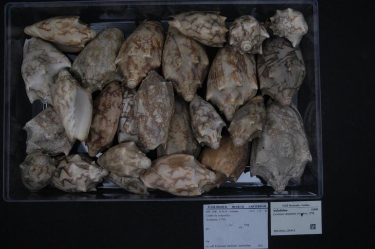 | Keywords: Naturalis Biodiversity Center - ZMA.MOLL.226418 - Cymbiola vespertilio Linnaeus, 1758 - Volutidae - Mollusc shell.jpeg artwork Dimensions artwork Document type Volutidae Cymbiola Individual count Infraspecific epithet Infraspecific rank Institution Naturalis Kind of unit artwork Kind of unit specimen shell Life stage Medium artwork Nomenclatural code Scale the width of the text on the species/QR-code label is 38 mm Occurrence ID page Neogastropoda Other fields Other versions artwork Permission license Naturalis donation CC-0 Mollusca Publication location Scientific name Cymbiola vespertilio Linnaeus 1758 Scientific name authorship Linnaeus 1758 Source url http //bioportal naturalis nl Specific epithet vespertilio State or province Subject keywords artwork Subject keywords publication Title artwork Title publication Type status Uploaded with GWToolset Naturalis_Biodiversity_Center_-_ZMA MOLL 226418_-_Cymbiola_vespertilio_Linnaeus _1758_-_Volutidae_-_Mollusc_shell http //medialib naturalis nl/file/id/ZMA MOLL 226418/format/large Media donated by Naturalis Biodiversity Center Molluscs at Naturalis from the Zoölogisch Museum Amsterdam Cymbiola vespertilio Cymbiola |