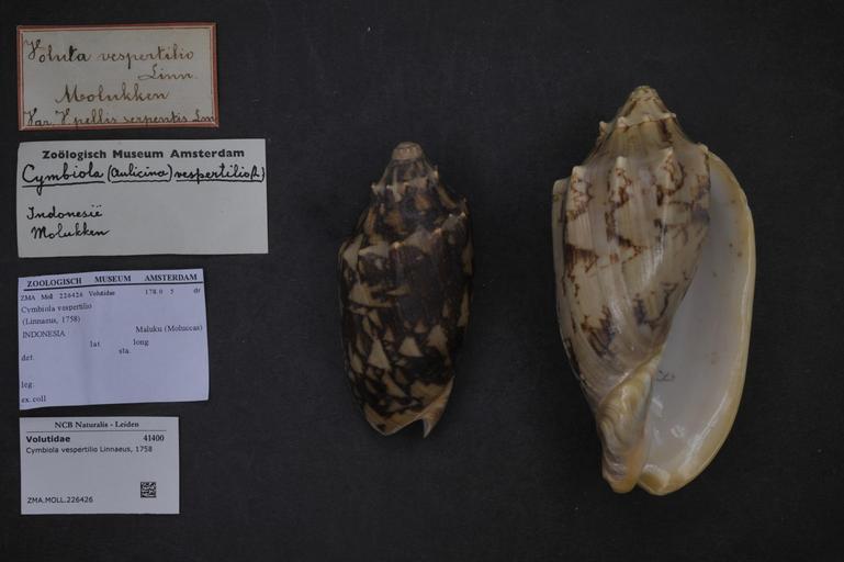 | Keywords: Naturalis Biodiversity Center - ZMA.MOLL.226426 - Cymbiola vespertilio Linnaeus, 1758 - Volutidae - Mollusc shell.jpeg artwork Dimensions artwork Document type Volutidae Cymbiola Individual count Infraspecific epithet Infraspecific rank Institution Naturalis Kind of unit artwork Kind of unit specimen shell Life stage Medium artwork Nomenclatural code Scale the width of the text on the species/QR-code label is 38 mm Occurrence ID page Neogastropoda Other fields Other versions artwork Permission license Naturalis donation CC-0 Mollusca Publication location Scientific name Cymbiola vespertilio Linnaeus 1758 Scientific name authorship Linnaeus 1758 Source url http //bioportal naturalis nl Specific epithet vespertilio State or province Subject keywords artwork Subject keywords publication Title artwork Title publication Type status Uploaded with GWToolset Naturalis_Biodiversity_Center_-_ZMA MOLL 226426_-_Cymbiola_vespertilio_Linnaeus _1758_-_Volutidae_-_Mollusc_shell http //medialib naturalis nl/file/id/ZMA MOLL 226426/format/large Media donated by Naturalis Biodiversity Center Molluscs at Naturalis from the Zoölogisch Museum Amsterdam Cymbiola vespertilio Cymbiola |