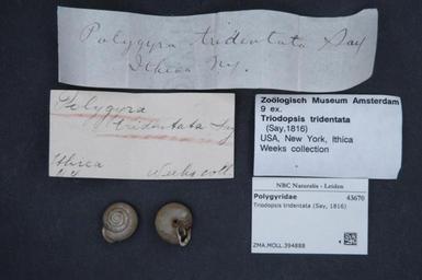 | Keywords: Naturalis Biodiversity Center - ZMA.MOLL.394888 - Triodopsis tridentata (Say, 1816) - Polygyridae - Mollusc shell.jpeg artwork Dimensions artwork Document type Polygyridae subfamily Triodopsinae Triodopsis Individual count Infraspecific epithet Infraspecific rank Institution Naturalis Kind of unit artwork Kind of unit specimen shell Life stage Medium artwork Nomenclatural code Source institute Rijksmuseum van Natuurlijke Historie Leiden Scale the width of the text on the species/QR-code label is 38 mm Occurrence ID page Other fields Other versions artwork Permission license Naturalis donation CC-0 Mollusca Publication location Scientific name Triodopsis tridentata Say 1816 Scientific name authorship Say 1816 Source url http //bioportal naturalis nl Specific epithet tridentata State or province Subject keywords artwork Subject keywords publication Title artwork Title publication Type status Uploaded with GWToolset Naturalis_Biodiversity_Center_-_ZMA MOLL 394888_-_Triodopsis_tridentata_ Say _1816 _-_Polygyridae_-_Mollusc_shell http //medialib naturalis nl/file/id/ZMA MOLL 394888/format/large Molluscs at Naturalis from the Zoölogisch Museum Amsterdam Media donated by Naturalis Biodiversity Center Triodopsis tridentata Triodopsis |