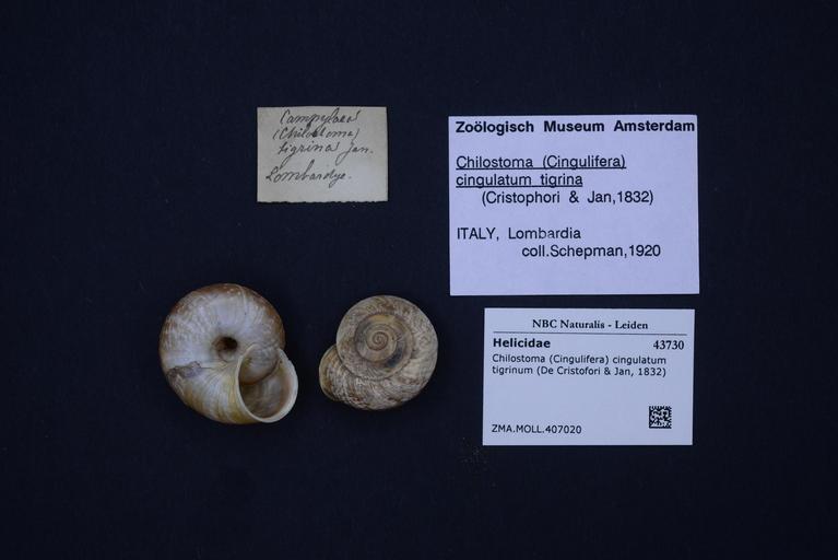 | Keywords: Naturalis Biodiversity Center - ZMA.MOLL.407020 - Chilostoma (Cingulifera) cingulatum tigrinum (De Cristofori & Jan, 1832) - Helicidae - Mollusc shell.jpeg artwork Dimensions artwork Document type Helicidae subfamily Helicigoninae Chilostoma Individual count Infraspecific epithet tigrinum Infraspecific rank Institution Naturalis Kind of unit artwork Kind of unit specimen shell Life stage Medium artwork Nomenclatural code Source institute Zoölogisch Museum Amsterdam Scale the width of the text on the species/QR-code label is 38 mm Occurrence ID page Other fields Other versions artwork Permission license Naturalis donation CC-0 Mollusca Publication location Scientific name Chilostoma Cingulifera cingulatum tigrinum De Cristofori Jan 1832 Scientific name authorship De Cristofori Jan 1832 Source url http //bioportal naturalis nl Specific epithet cingulatum State or province Subject keywords artwork Subject keywords publication Title artwork Title publication Type status Uploaded with GWToolset Naturalis_Biodiversity_Center_-_ZMA MOLL 407020_-_Chilostoma_ Cingulifera _cingulatum_tigrinum_ De_Cristofori_ _Jan _1832 _-_Helicidae_-_Mollusc_shell http //medialib naturalis nl/file/id/ZMA MOLL 407020/format/large Molluscs at Naturalis from the Zoölogisch Museum Amsterdam Media donated by Naturalis Biodiversity Center Chilostoma cingulatum Chilostoma |