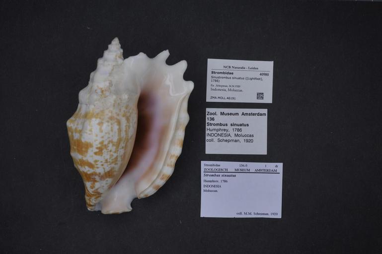 Keywords: Naturalis Biodiversity Center - ZMA.MOLL.46191 - Sinustrombus sinuatus (-Lightfoot-, 1786) - Strombidae - Mollusc shell.jpeg artwork Dimensions artwork Document type Strombidae Sinustrombus Individual count Infraspecific epithet Infraspecific rank Institution Naturalis Kind of unit artwork Kind of unit specimen shell Life stage Indonesia Moluccas Medium artwork Nomenclatural code Source institute Zoölogisch Museum Amsterdam Scale the width of the text on the species/QR-code label is 38 mm Occurrence ID page Other fields Other versions artwork Permission license Naturalis donation CC-0 Mollusca Publication location Scientific name Sinustrombus sinuatus Lightfoot 1786 Scientific name authorship Lightfoot 1786 Source url http //bioportal naturalis nl Specific epithet sinuatus State or province Moluccas Subject keywords artwork Subject keywords publication Title artwork Title publication Type status Uploaded with GWToolset Naturalis_Biodiversity_Center_-_ZMA MOLL 46191_-_Sinustrombus_sinuatus_ Lightfoot _1786 _-_Strombidae_-_Mollusc_shell http //medialib naturalis nl/file/id/ZMA MOLL 46191/format/large Molluscs at Naturalis from the Zoölogisch Museum Amsterdam Media donated by Naturalis Biodiversity Center Sinustrombus sinuatus Sinustrombus |