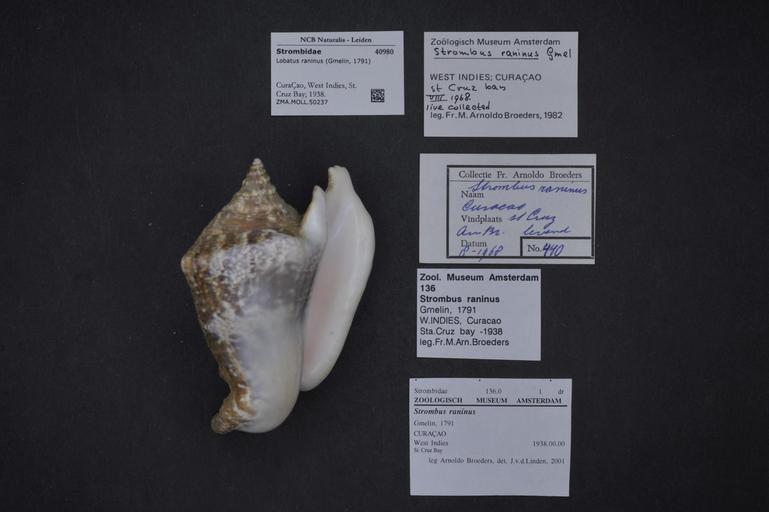| Keywords: Naturalis Biodiversity Center - ZMA.MOLL.50237 - Lobatus raninus (Gmelin, 1791) - Strombidae - Mollusc shell.jpeg artwork Dimensions artwork Document type Strombidae Lobatus Individual count Infraspecific epithet Infraspecific rank Institution Naturalis Kind of unit artwork Kind of unit specimen shell Life stage Curaçao West Indies St Cruz Bay; 1938 Medium artwork Nomenclatural code Source institute Zoölogisch Museum Amsterdam Scale the width of the text on the species/QR-code label is 38 mm Occurrence ID page Other fields Other versions artwork Permission license Naturalis donation CC-0 Mollusca Publication location Scientific name Lobatus raninus Gmelin 1791 Scientific name authorship Gmelin 1791 Source url http //bioportal naturalis nl Specific epithet raninus State or province Curaçao Subject keywords artwork Subject keywords publication Title artwork Title publication Type status Uploaded with GWToolset Naturalis_Biodiversity_Center_-_ZMA MOLL 50237_-_Lobatus_raninus_ Gmelin _1791 _-_Strombidae_-_Mollusc_shell http //medialib naturalis nl/file/id/ZMA MOLL 50237/format/large Molluscs at Naturalis from the Zoölogisch Museum Amsterdam Media donated by Naturalis Biodiversity Center Lobatus raninus Lobatus |