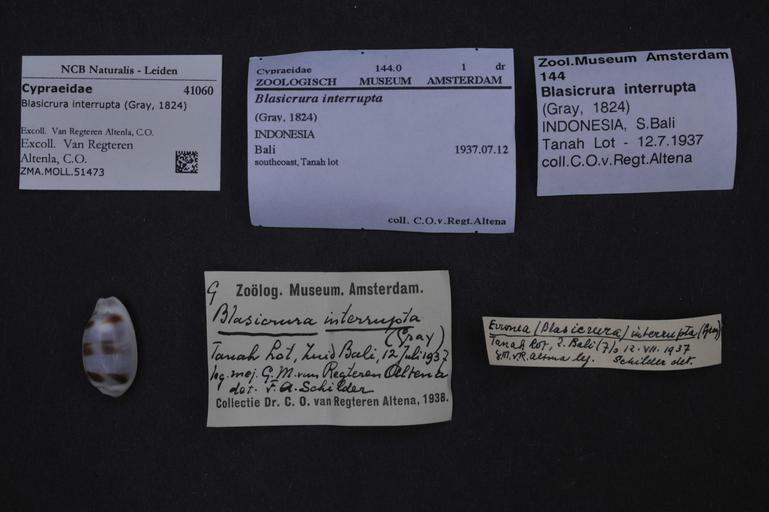 | Keywords: Naturalis Biodiversity Center - ZMA.MOLL.51473 - Blasicrura interrupta (Gray, 1824) - Cypraeidae - Mollusc shell.jpeg artwork Dimensions artwork Document type Cypraeidae subfamily Cypraeovulinae Blasicrura Individual count Infraspecific epithet Infraspecific rank Institution Naturalis Kind of unit artwork Kind of unit specimen shell Life stage Indonesia Bali southcoast Tanah lot; 12-vii-1937 Medium artwork Nomenclatural code Source institute Zoölogisch Museum Amsterdam Scale the width of the text on the species/QR-code label is 38 mm Occurrence ID page Other fields Other versions artwork Permission license Naturalis donation CC-0 Mollusca Publication location Scientific name Blasicrura interrupta Gray 1824 Scientific name authorship Gray 1824 Source url http //bioportal naturalis nl Specific epithet interrupta State or province Bali Subject keywords artwork Subject keywords publication Title artwork Title publication Type status Uploaded with GWToolset Naturalis_Biodiversity_Center_-_ZMA MOLL 51473_-_Blasicrura_interrupta_ Gray _1824 _-_Cypraeidae_-_Mollusc_shell http //medialib naturalis nl/file/id/ZMA MOLL 51473/format/large Molluscs at Naturalis from the Zoölogisch Museum Amsterdam Media donated by Naturalis Biodiversity Center Blasicrura interrupta Blasicrura |