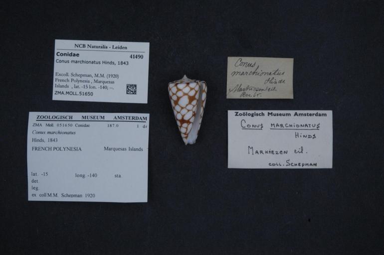 Keywords: Naturalis Biodiversity Center - ZMA.MOLL.51650 - Conus marchionatus Hinds, 1843 - Conidae - Mollusc shell.jpeg artwork Dimensions artwork Document type Conidae Conus Individual count Infraspecific epithet Infraspecific rank Institution Naturalis Kind of unit artwork Kind of unit specimen shell Life stage French Polynesia Marquesas Islands lat -15 lon -140 Medium artwork Nomenclatural code Source institute Zoölogisch Museum Amsterdam Scale the width of the text on the species/QR-code label is 38 mm Occurrence ID page Other fields Other versions artwork Permission license Naturalis donation CC-0 Mollusca Publication location Scientific name Conus marchionatus Hinds 1843 Scientific name authorship Hinds 1843 Source url http //bioportal naturalis nl Specific epithet marchionatus State or province Marquesas Islands Subject keywords artwork Subject keywords publication Title artwork Title publication Type status Uploaded with GWToolset Naturalis_Biodiversity_Center_-_ZMA MOLL 51650_-_Conus_marchionatus_Hinds _1843_-_Conidae_-_Mollusc_shell http //medialib naturalis nl/file/id/ZMA MOLL 51650/format/large Molluscs at Naturalis from the Zoölogisch Museum Amsterdam Media donated by Naturalis Biodiversity Center Conus marchionatus Conus