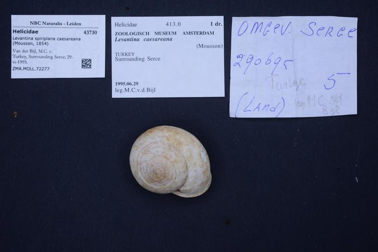 | Keywords: Naturalis Biodiversity Center - ZMA.MOLL.72277 - Levantina (Levantina) spiriplana caesareana (Mousson, 1854) - Helicidae - Mollusc shell.jpeg artwork Dimensions artwork Document type Helicidae subfamily Helicinae Levantina Individual count Infraspecific epithet caesareana Infraspecific rank Institution Naturalis Kind of unit artwork Kind of unit specimen shell Life stage Turkey Surrounding Serce; 29-vi-1995 Medium artwork Nomenclatural code Source institute Zoölogisch Museum Amsterdam Scale the width of the text on the species/QR-code label is 38 mm Occurrence ID page Other fields Other versions artwork Permission license Naturalis donation CC-0 Mollusca Publication location Scientific name Levantina Levantina spiriplana caesareana Mousson 1854 Scientific name authorship Mousson 1854 Source url http //bioportal naturalis nl Specific epithet spiriplana State or province Subject keywords artwork Subject keywords publication Title artwork Title publication Type status Uploaded with GWToolset Naturalis_Biodiversity_Center_-_ZMA MOLL 72277_-_Levantina_ Levantina _spiriplana_caesareana_ Mousson _1854 _-_Helicidae_-_Mollusc_shell http //medialib naturalis nl/file/id/ZMA MOLL 72277/format/large Molluscs at Naturalis from the Zoölogisch Museum Amsterdam Media donated by Naturalis Biodiversity Center Levantina spiriplana Levantina |
