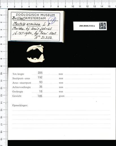 Keywords: Naturalis Biodiversity Center - ZMA.MAM.21332.a lab - Mustela erminea Linnaeus - skull.jpeg artwork Dimensions artwork Document type Mustela Individual count 1 Infraspecific epithet Infraspecific rank Institution Naturalis Kind of unit artwork Kind of unit specimen skull Life stage Muiden bij kruitfabriek Medium artwork Nomenclatural code Occurrence ID page Other fields Other versions artwork Permission license Naturalis donation CC-0 Publication location Scientific name Mustela erminea Linnaeus Scientific name authorship Linnaeus female Source url http //bioportal naturalis nl Specific epithet erminea State or province Subject keywords artwork Subject keywords publication Title artwork Title publication Type status Uploaded with GWToolset Naturalis_Biodiversity_Center_-_ZMA MAM 21332 a_lab_-_Mustela_erminea_Linnaeus_-_skull http //medialib naturalis nl/file/id/ZMA MAM 21332 a_lab/format/large Mammals at Naturalis from the Zoölogisch Museum Amsterdam Media donated by Naturalis Biodiversity Center Mustela erminea Mustela |