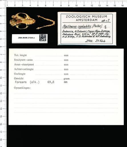 | Keywords: Naturalis Biodiversity Center - ZMA.MAM.21544.a pal - Nyctimene cephalotes - skull.jpeg artwork Dimensions artwork Document type Nyctimene Individual count 1 Infraspecific epithet Infraspecific rank Institution Naturalis Kind of unit artwork Kind of unit specimen skull Life stage Indonesia N Sulawesi Cagar Alam Dumoga Moinakom River 525m Medium artwork Nomenclatural code Occurrence ID page Other fields Other versions artwork Permission license Naturalis donation CC-0 Publication location Scientific name Nyctimene cephalotes Scientific name authorship female Source url http //bioportal naturalis nl Specific epithet cephalotes State or province Subject keywords artwork Subject keywords publication Title artwork Title publication Type status Uploaded with GWToolset Naturalis_Biodiversity_Center_-_ZMA MAM 21544 a_pal_-_Nyctimene_cephalotes_-_skull http //medialib naturalis nl/file/id/ZMA MAM 21544 a_pal/format/large Mammals at Naturalis from the Zoölogisch Museum Amsterdam Media donated by Naturalis Biodiversity Center Nyctimene cephalotes Nyctimene |