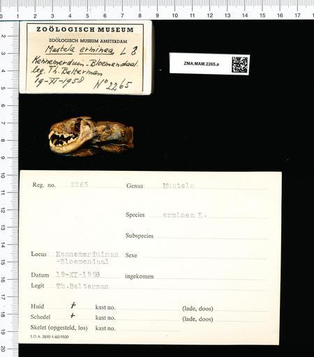 Keywords: Naturalis Biodiversity Center - ZMA.MAM.2265.a lat 1 - Mustela erminea Linnaeus - skull.jpeg artwork Dimensions artwork Document type Mustela Individual count 1 Infraspecific epithet Infraspecific rank Institution Naturalis Kind of unit artwork Kind of unit specimen skull Life stage Netherlands Noord Holland Kennemerduinen Medium artwork Nomenclatural code Occurrence ID page Other fields Other versions artwork Permission license Naturalis donation CC-0 Publication location Scientific name Mustela erminea Linnaeus Scientific name authorship Linnaeus male Source url http //bioportal naturalis nl Specific epithet erminea State or province Noord Holland Subject keywords artwork Subject keywords publication Title artwork Title publication Type status Uploaded with GWToolset Naturalis_Biodiversity_Center_-_ZMA MAM 2265 a_lat_1_-_Mustela_erminea_Linnaeus_-_skull http //medialib naturalis nl/file/id/ZMA MAM 2265 a_lat_1/format/large Mammals at Naturalis from the Zoölogisch Museum Amsterdam Media donated by Naturalis Biodiversity Center Mustela erminea Mustela |