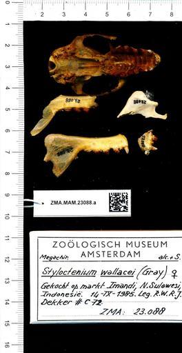 | Keywords: Naturalis Biodiversity Center - ZMA.MAM.23088.a pal - Styloctenium wallacei Gray - skull.jpeg artwork Dimensions artwork Document type Styloctenium Individual count Infraspecific epithet Infraspecific rank Institution Naturalis Kind of unit artwork Kind of unit specimen skull Life stage Gekocht op markt Imandi N Sulawesi Indonesia Medium artwork Nomenclatural code Occurrence ID page Other fields Other versions artwork Permission license Naturalis donation CC-0 Publication location Scientific name Styloctenium wallacei Gray Scientific name authorship Gray female Source url http //bioportal naturalis nl Specific epithet wallacei State or province Subject keywords artwork Subject keywords publication Title artwork Title publication Type status Uploaded with GWToolset Naturalis_Biodiversity_Center_-_ZMA MAM 23088 a_pal_-_Styloctenium_wallacei_Gray_-_skull http //medialib naturalis nl/file/id/ZMA MAM 23088 a_pal/format/large Mammals at Naturalis from the Zoölogisch Museum Amsterdam Media donated by Naturalis Biodiversity Center Styloctenium wallacei Styloctenium |