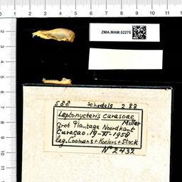Keywords: Naturalis Biodiversity Center - ZMA.MAM.52275 lat - Leptonycteris curasoae - skull.jpeg artwork Dimensions artwork Document type Leptonycteris Individual count 1 Infraspecific epithet Infraspecific rank Institution Naturalis Kind of unit artwork Kind of unit specimen skull Life stage Grot Plantage Noordkant CuraƧao Medium artwork Nomenclatural code Occurrence ID page Other fields Other versions artwork Permission license Naturalis donation CC-0 Publication location Scientific name Leptonycteris curasoae Scientific name authorship female Source url http //bioportal naturalis nl Specific epithet curasoae State or province Subject keywords artwork Subject keywords publication Title artwork Title publication Type status Uploaded with GWToolset Naturalis_Biodiversity_Center_-_ZMA MAM 52275_lat_-_Leptonycteris_curasoae_-_skull http //medialib naturalis nl/file/id/ZMA MAM 52275_lat/format/large Mammals at Naturalis from the Zoƶlogisch Museum Amsterdam Media donated by Naturalis Biodiversity Center Leptonycteris curasoae Leptonycteris |