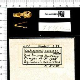 Keywords: Naturalis Biodiversity Center - ZMA.MAM.52275 pal - Leptonycteris curasoae - skull.jpeg artwork Dimensions artwork Document type Leptonycteris Individual count 1 Infraspecific epithet Infraspecific rank Institution Naturalis Kind of unit artwork Kind of unit specimen skull Life stage Grot Plantage Noordkant CuraƧao Medium artwork Nomenclatural code Occurrence ID page Other fields Other versions artwork Permission license Naturalis donation CC-0 Publication location Scientific name Leptonycteris curasoae Scientific name authorship female Source url http //bioportal naturalis nl Specific epithet curasoae State or province Subject keywords artwork Subject keywords publication Title artwork Title publication Type status Uploaded with GWToolset Naturalis_Biodiversity_Center_-_ZMA MAM 52275_pal_-_Leptonycteris_curasoae_-_skull http //medialib naturalis nl/file/id/ZMA MAM 52275_pal/format/large Mammals at Naturalis from the Zoƶlogisch Museum Amsterdam Media donated by Naturalis Biodiversity Center Leptonycteris curasoae Leptonycteris |