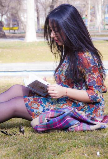Keywords: nature blue sky beautiful woman face outdoors reading park