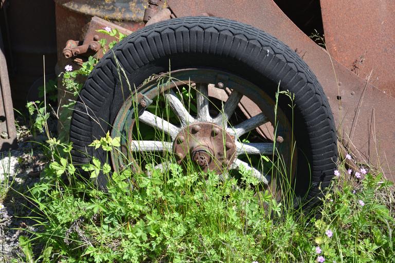 Keywords: nature spring tires veteran retro wood flowers garden green grass rust sheet metal fårö
