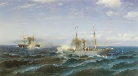 Keywords: Naval battle between "Vesta" and "Fetkh-i Bulend" at the Black Sea, July 11, 1877.jpg Artwork Creator Rufin Sudkovsky en Fight the steamer Vesta with the Ottoman ironclad Fetkh-i Bulend at the Black Sea July 11 1877 1881 oil on canvas cm 75 130 Institution Central Naval Museum object history credit line accession number http //www art-catalog ru/picture php id_picture 12604 art-catalog ru PD-old-100 Rufin Sudkovsky Paintings in the Central Naval Museum Battles of the Russo-Turkish War 1877 “1878 Vesta ship 1856 Feth-i Bülend ship 1870 Ships in art of the Ottoman Empire Paintings of Ottoman battles |