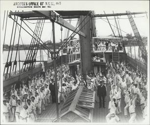 Keywords: archives state records nsw staterecordsnsw newsouthwales blackandwhite sobroan ship srnsw:series=4481 sobraon black and white Title: Naval cadets doing physical training on the N.S.S. 'Sobraon' On the 8th Novemeber 1892 the Sobraon replaced the Vernon as the Industrial School for Boys training ship. The Sobraon was three times the size of its predecessor and by 1893 it averaged 263 boys over the year. By July 1911 the last of the Sobraon boys were rehoused at the Mittagong Farm Home for Boys and the Brush Farm Home for Boys and the Sobraon was abandoned. Dated: 11/08/1893 Digital ID: 4481_a026_000969 Rights: No known copyright restrictions www.records.nsw.gov.au/about-us/rights-and-permissions We'd love to hear from you if you use our photos/documents. Many other photos in our collection are available to view and browse on our website using Photo Investigator. Title: Naval cadets doing physical training on the N.S.S. 'Sobraon' On the 8th Novemeber 1892 the Sobraon replaced the Vernon as the Industrial School for Boys training ship. The Sobraon was three times the size of its predecessor and by 1893 it averaged 263 boys over the year. By July 1911 the last of the Sobraon boys were rehoused at the Mittagong Farm Home for Boys and the Brush Farm Home for Boys and the Sobraon was abandoned. Dated: 11/08/1893 Digital ID: 4481_a026_000969 Rights: No known copyright restrictions www.records.nsw.gov.au/about-us/rights-and-permissions We'd love to hear from you if you use our photos/documents. Many other photos in our collection are available to view and browse on our website using Photo Investigator.