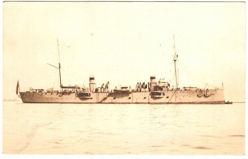 Keywords: Naval ship XX.jpg Naval ship post card about year 1909 Unknown name - unknown nationality on mooring buoy China port apparently some small cruiser Beginner's Guide to Warship Recognition Yes this looks like a small cruiser or large gunboat/sloop/aviso built between 1890 and 1910 The guns are not protected by shields and that rules out larger cruisers and armoured cruisers and it rules out most newer ships The disposition of the guns is very typical of small cruisers of the time but the long barrels of the guns point to countries like USA and France Notice the two funnels very far apart This is typical of ships built in Italy and France Notice also the small hat on the funnels This is a typical French feature so here's looking at you France Take your copy of Jane's Fighting Ships 1906-07 please and among the French warships on page 175 you will find a photo of the D'Estrées Voila Just one problem that photo shows three masts So take your copy of Conway's All The World's Fighting Ships 1860-1905 find the D'Estrées on page 313 and read that one mast was indeed removed later Conclusion This is the D'Estrées launched 1897 or her sister the Infernet launched in 1899 Naval ship China port Postcard about ca 1909 Author PD-old D'Estrées class cruisers