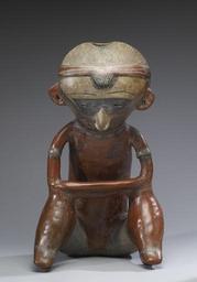 | Keywords: Nayarit - Seated Male - Walters 20092061.jpg Lagunillas figures often portray men usually in a seated position with elbows resting on bent knees and forearms crossed on top of each other The torso leans forward and the face gazes downward This figure's loins are wrapped in a relatively wide hip cloth of unadorned fabric He wears a textile or plant fiber triple-strand band around his head a forelock of hair falling below the band His face is extensively painted with black designs including masklike half circles around his eyes and whisker-like motifs extending outward from the corners of his mouth Arm and ankle bands perhaps made of cut shell adorn his limbs; similar multi-stringed ornaments have been found adorning corporeal remains in many tombs from this region 300 BC-AD 200 burnished earthenware slip paint cm 46 2 27 2 35 4 accession number 2009 20 61 80216 Stendahl Galleries Los Angeles date and mode of acquisition unknown John G Bourne 1960s by purchase Walters Art Museum Gift of John Bourne 2009 place of origin Nayarit Mexico Walters Art Museum license Nayarit Pre-Columbian pottery in the Walters Art Museum Nayarit pottery Media contributed by the Walters Art Museum needs category review |