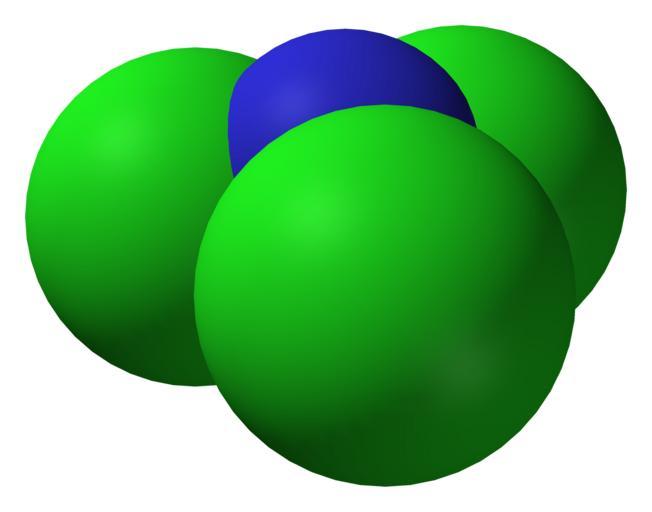| Keywords: NCl3-by-ED-from-CRC-91-3D-sf-web.png Space-filling model of the the nitrogen trichloride molecule NCl<sub>3</sub> Colour code Nitrogen N blue Chlorine Cl green Structural information determined by gas-phase electron diffraction from http //www hbcpnetbase com/ CRC Handbook 91<sup>st</sup> edition page 9 “25 Image generated in http //accelrys com/products/discovery-studio/visualization/discovery-studio-visualizer html Accelrys DS Visualizer Own 2011-03-13 Ben Mills Benjah-bmm27 Images by Ben Mills Nitrogen trichloride |
