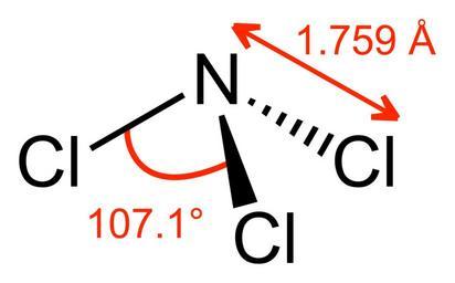| Keywords: NCl3-dimensions-by-ED-from-CRC-91-2D.png NCl3 dimensions svg Structural formula of the nitrogen trichloride molecule NCl<sub>3</sub> with a nitrogen-chlorine bond of length 1 759 Ã… and a Cl-N-Cl angle of 107 1 ° Structural information determined by gas-phase electron diffraction from http //www hbcpnetbase com/ CRC Handbook 91<sup>st</sup> edition page 9 “25 Own 2011-03-10 Ben Mills Benjah-bmm27 Images by Ben Mills Nitrogen trichloride | ||||