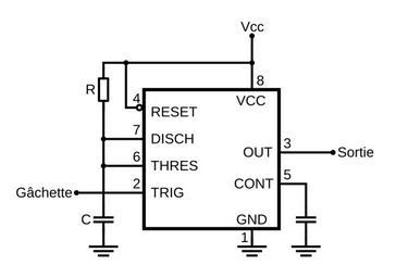 Keywords: NE555 Monostable Diagram fr.svg NE555 monostable configuration schematics Own 2007-09-25 BlanchardJ Created with Inkscape ElCompLib 555 timer IC Monostable circuits with 555 timer