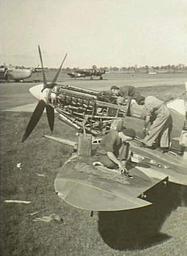 | Keywords: NEA0687No.3AircraftDepot1945.jpg  Amberley Qld At No 3 Aircraft Depot RAAF removing camouflage paint from Spitfire Mk VIII aircraft Nearest camera 170172 Leading Aircraftman LAC E A C Richardson flight rigger of Kedron Qld; centre 426145 LAC N G Neilson fitter IIA of Bundaberg Qld; 65677 LAC K J Sharp fitter IIA of Canowindra NSW The men are using paint remover and spatulas The Spitfire's cowlings are off revealing the Merlin engine in detail In the background are a Consolidated Liberator C-87 transport of the RAF DAP Beaufighter A8-129 of No 93 Squadron RAAF and two other Liberator aircraft NEA0687 Department of Air 1945-07-18 PD-Australia PD-1996 Australia Royal Australian Air Force in World War II Supermarine Spitfire Mark VIII Black and white photographs |