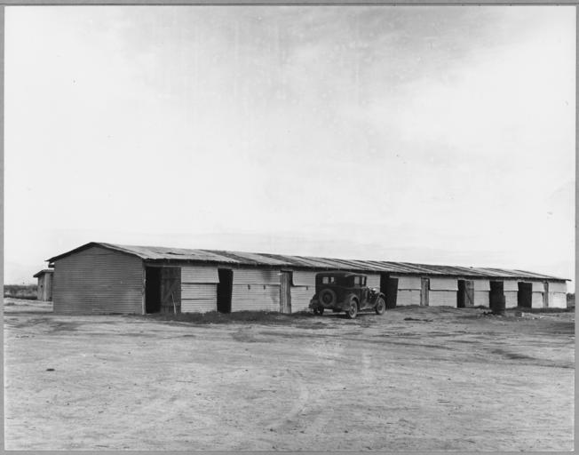 Keywords: Near Buckeye, Maricopa County, Arizona. Cotton pickers' barracks. Double row of 20 single-room apart . . . - NARA - 522248.jpg Scope and content Full caption reads as follows Near Buckeye Maricopa County Arizona Cotton pickers' barracks Double row of 20 single-room apartments with dirt floors Corrugated iron construction including partitions Rooms about 10 feet by 10 feet size When photograph was made all pickers were at work in the field General notes 522248 Local identifier 83-G-44079 Department of Agriculture Bureau of Agricultural Economics Division of Economic Information ca 1922 - ca 1953 NARA-Author Lange Dorothea 1895-1965 Photographer 1372774 <br /> Still Picture Records Section Special Media Archives Services Division NWCS-S National Archives at College Park 8601 Adelphi Road College Park MD 20740-6001 11/1940 Record group Record Group 83 Records of the Bureau of Agricultural Economics 1876 - 1959 Record group ARC 412 Photographic Prints Documenting Programs and Activities of the Bureau of Agricultural Economics and Predecessor Agencies compiled ca 1922 - ca 1947 documenting the period ca 1911 - ca 1947 Series ARC 521048 File unit File unit ARC Variant control numbers NAIL Control Number NWDNS-83-G-44079 Other versions <gallery> File Near_Buckeye _Maricopa_County _Arizona _Cotton_pickers'_barracks _Double_row_of_20_single-room_apart_ _ _ _-_NARA_-_522248 tif tif File Near_Buckeye _Maricopa_County _Arizona _Cotton_pickers'_barracks _Double_row_of_20_single-room_apart_ _ _ _-_NARA_-_522248 jpg jpg </gallery> NARA-cooperation PD-USGov Dorothea Lange Buckeye Arizona