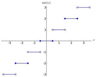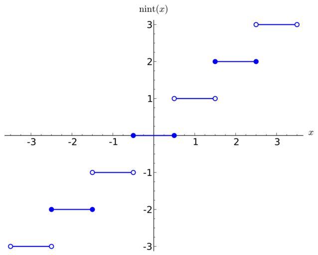 | Keywords: Nearest integer.svg Created with Sage en The nearest integer round function which rounds to the nearest even integer It was generated by the following Sage code <source lang python > plot round -3 5 3 5 exclude a - 0 5 for a in range -3 5 ymax 3 zorder 3 axes_labels ' x ' r' \mathrm nint x ' fontsize 14 thickness 1 5 + point -2 5 -2 rgbcolor 'blue' pointsize 45 zorder 4 + point -1 5 -2 rgbcolor 'blue' pointsize 45 zorder 4 + point -0 5 0 rgbcolor 'blue' pointsize 45 zorder 4 + point 0 5 0 rgbcolor 'blue' pointsize 45 zorder 4 + point 1 5 2 rgbcolor 'blue' pointsize 45 zorder 4 + point 2 5 2 rgbcolor 'blue' pointsize 45 zorder 4 + point -3 5 -3 pointsize 45 zorder 4 + point -2 5 -3 pointsize 45 zorder 4 + point -1 5 -1 pointsize 45 zorder 4 + point -0 5 -1 pointsize 45 zorder 4 + point 0 5 1 pointsize 45 zorder 4 + point 1 5 1 pointsize 45 zorder 4 + point 2 5 3 pointsize 45 zorder 4 + point 3 5 3 pointsize 45 zorder 4 + point -3 5 -3 rgbcolor 'white' pointsize 20 zorder 5 + point -2 5 -3 rgbcolor 'white' pointsize 20 zorder 5 + point -1 5 -1 rgbcolor 'white' pointsize 20 zorder 5 + point -0 5 -1 rgbcolor 'white' pointsize 20 zorder 5 + point 0 5 1 rgbcolor 'white' pointsize 20 zorder 5 + point 1 5 1 rgbcolor 'white' pointsize 20 zorder 5 + point 2 5 3 rgbcolor 'white' pointsize 20 zorder 5 + point 3 5 3 rgbcolor 'white' pointsize 20 zorder 5 </source> 2012-01-05 own Eviatar Bach cc-zero Uploaded with UploadWizard Step functions Images with Sage source code Files by User InverseHypercube |