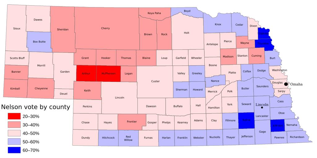 | Keywords: Nebraska 1990 gubernatorial general election.svg en Map of Nebraska showing percent of vote won by Democratic Party candidate Ben Nelson in each county in the 1990 gubernatorial general election Percentages were calculated from raw numbers in http //nlc1 nlc state ne us/epubs/S1200/S001-1990prim_gen pdf Official Report of the Board of State Canvassers of the State of Nebraska Primary Election May 15 1990 General Election November 6 1990 general election p 5 retrieved 2016-01-19 Note that the map shows the percentage of vote for Nelson not which party's candidate won each county In Hall and Stanton Counties Nelson won a narrow plurality of the vote but because of write-ins failed to win a majority Thus those two counties appear light-red on this map although Nelson secured more votes there than Republican candidate Kay Orr 2016-01-23 own Ammodramus other versions cc-zero Pictures by Ammodramus SVG maps of Nebraska 1990 in Nebraska 1990 United States gubernatorial election maps Nebraska gubernatorial election maps |