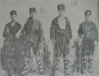 | Keywords: Nedyalko Kilev, Shteryu Georgiev, Atanas Tropchov.JPG едялко Килев Ще ю Гео гиев неизвестен и Атанас Т опчов Т опчев Чепела е 1899 година Ка аманджуков Х исто Западнот акийските бълга и София 1934 ст 160 1899 author Anonymous-EU IMARO People of Chepelare Revolutionaries from Bulgaria |