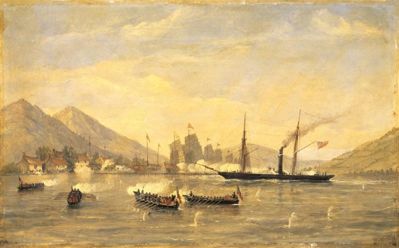 Keywords: Nemesis Attacking a Masked Battery.jpg On 23 February 1841 Nemesis in consort with pinnaces from the British ships Calliope Samarang Herald and Alligator proceeded to Anson's Bay where the Chinese had been observed making hostile preparations by placing stakes across the river The stakes can be seen in the painting between the background junks and Nemesis As Nemesis slowed to pull up the stakes and create a passage a masked battery close abreast on shore opened fire century 19 http //blueworldwebmuseum org/item php id 261 Creator William Adolphus Knell PD-old-100 Battle of the Bogue Nemesis ship 1839 Paintings of junks ships William Adolphus Knell |